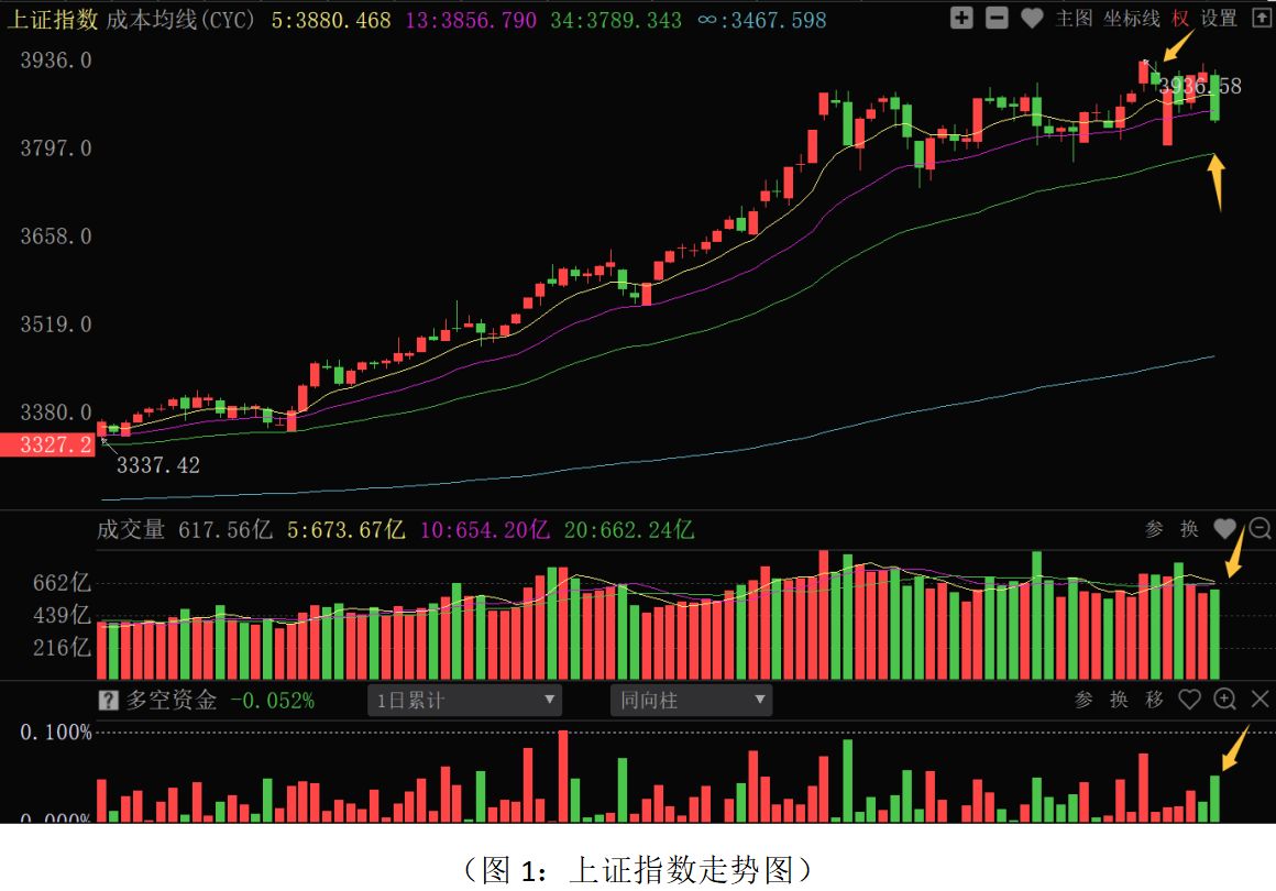 消息面,今日有两大重要消息,第一,国家统计局公布三季度工业增加值、社会消费品零售总额、固定资产投资总额,以及三季度的GDP增速等数据;第二,“四中”全会召开。三季度经济数据走向对于市场判断经济增长情况,以及后续的政策出台力度有重要的指引。目前市场预期经济数据低于二季度数据,对市场短期走势仍会有一定的扰动,增量政策的定调将是市场能否企稳的关键。“四中”全会将公布“十五五”规划公报,部署下半年经济工作,会涉及未来5年的经济和各行业的发展定调,对于市场的中期信心和短期的热点发展有重要的指引。从上证指数走势来看:上周再度冲击3900点整数关口未果,并出现明显的冲高回落走势,对市场短期做多积极性有一定的挫伤。市场冲高回落原因,第一点、三季度经济数据公布在即,资金观望态度增加;第二点,中美关税政策仍有不确定性,11月初APEC会议之前的博弈可能会反复;第三点,进入上市公司三季报业绩公布期,加大高估值、题材股的风险释放。目前股指跌破5日、13日成本均线,上周五伴随着多空资金的明显流出,短线趋势有趋弱的表现。尤其是8月底以来,股指总体沿着13日成本均线震荡,当前跌破13日出个本均线,如果短期不能强势收回,指数仍有回探8月底震荡箱体底部和34日成本均线一带的可能。总体上,全年经济完成5%的既定目标概率较大。同时,中国稳经济宏观政策有一定的稳定性和延续性,当前中美同意尽快举行新一轮经贸磋商,市场整体不会有大的系统性风险。10月20-10月23日召开“四中全会”,会公布“十五五”规划公报,市场调整之后, 政策预期下短线做空动能会有所收敛。由于“十五五”规划是着眼于中长期的政策定调,对短期走势影响相对有限。市场还是着眼于当前的中美关税问题,以及三季报业绩带来个股结构性风险的释放。十月中下旬三季报业绩风险释放完毕,11月初APEC会议中美能否达成新一轮的关税会谈结果将是关键,市场的震荡走势可能会延续至月底阶段。技术上关注34日成本均线的得失,一旦失守震荡幅度会加大,震荡时间会延长,密切关注经济数据和增量政策的定调和出台情况。从0Z指数走势来看:股指震荡下跌,跌破无穷成本均线,无穷成本均线是非常重要的中长期趋势均线,短线跌破不能快速收回,接下来市场走势可能会进入波段探底走势中。目前技术和心理支撑在9月4日的低点位置。由于前期高点和筹码密集峰压力较大,短期市场难以上行压力较大。从短期结构牛(大盘)指标来看,马股比例开始拐头向下至60%左右;牛股比例同步小幅下降至15%左右,熊股比例明显抬升至23%左右。可以看出部分强势股和横盘个股正在向熊股转化,个股整体风险在增加。从市场盈亏指标(CYS13)来看,目前指标数值在-2.558,距离-5的群体性超跌仍有一定距离。操作上应多看少动,不宜盲目抄底,采取稳健或防御性策略,总仓位控制在五成左右,底仓持股为主,短线品种应根据资金流向和决策信号做好仓位调整。