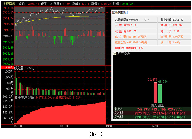 今日早间大盘高开,并继续上攻,虽然在触及到3990点后,市场出现震荡,但盘中向下回探的幅度很小,至中午收盘时,指数位于3991点。从日K线图上看,今天上午大盘高开高走,继续向上拉升,目前指数已到达3990点上方,距离突破4000点整数大关不足10个点,可见市场短期走势依然处于强势格局当中,只要多方后续力量不断跟上,行情就有望突破4000点大关,打开进一步上涨的空间。从下方的多空资金来看,早间开盘后,多方就占据优势,随后资金持续流入。截止到中午收盘时,沪市当中多方力量高于空方超过4个百分点,资金流入240多亿。从六大战区的情况分别来看,截止到今日中午收盘时,六个战区均为资金流入状态,其中不仅深中大盘战区资金流入超过130亿,沪中大盘战区的资金流入额更是高达215亿。可见今日上午多方全面发力,各战区均有资金持续进场加仓,从而推动市场向4000点发起冲击。以目前投资者的做多热情来看,空方在短期内恐很难组织起大规模反击,故此不排除接下来大盘有站上4000点并继续向上拉升的可能。建议大家可跟随资金步伐,积极优选个股,择机介入。