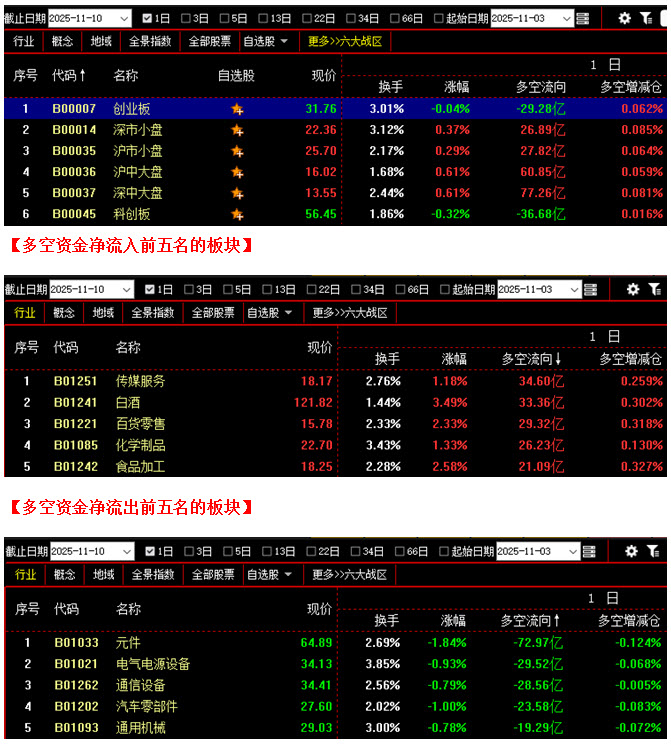 从板块资金动向数据来看,截止到今日午间收盘时,在资金流入榜上,传媒服务板块以34.60亿的资金流入额位居榜首;其次是白酒板块,资金流入33.36亿;此外,百货零售板块、化学制品板块、食品加工板块也都相继上榜,三个板块的资金流入额分别为29.32亿、26.23亿、21.09亿;再看资金流出榜,元件板块引领做空,资金流出72.97亿;其次是电气电源设备板块,资金流出29.52亿;此外,通信设备板块、汽车零部件板块、通用机械板块的资金流出额也都相对较多,分列资金流出榜第三到第五名位置。综合比较后可知,今日上午不仅传媒服务板块与白酒板块资金流入双双超过30亿,百货零售、化学制品、食品加工等板块的资金流入额也都在20亿之上,场内热点有向消费类转移的迹象,多方人气依然维持在较高水平;反观空方阵营,近期较为活跃的元件、电气电源设备、通信设备等板块纷纷出现在资金流出榜前列,整体抛压有所增大,导致大盘依然无法站稳在4000点整数关口上方。可见今日上午多空互不相让,双方争夺依然十分激烈,说明4000点整数关口附近市场分歧仍旧较大,后市行情方向仍不明朗,投资者还需继续跟踪观察。建议大家控制好仓位,同时密切关注场内多空资金的进出情况以及4000点整数关口的得失情况,如果多方后续力量能够不断跟上,市场连续多日站稳在4000点上方,后市就有望进一步向上攀升;反之,若是多方后续力量不足,大盘频频在4000点附近遇阻,则说明多方仍未做好进一步上攻的准备,后市行情很可能还会出现再次下探的动作。