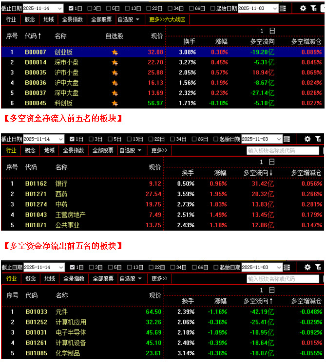 从板块资金动向数据来看,截止到今日午间收盘时,在资金流入榜上,银行板块以31.42亿的资金流入额位居榜首;其次是西药板块,资金流入20.32亿;此外,中药板块、主营房地产板块、公共事业板块也都相继上榜,三个板块的资金流入额分别为13.83亿、13.45亿、12.06亿;再看资金流出榜,元件板块引领做空,资金流出42.19亿;其次是计算机应用板块,资金流出25.41亿;此外,电子半导体板块、计算机设备板块、化学制品板块的资金流出额也都相对较多,分列资金流出榜第三到第五名位置。综合比较后可知,今日上午银行板块与主营房地产板块双双出现在资金流入榜前列,对大盘形成支撑作用,同时西药、中药等医药类板块也有联手做多迹象,场内热点有序轮动,有利于多方人气的稳定;反观空方阵营,不仅元件板块资金流出超过40亿,计算机应用、电子半导体、计算机设备等板块的资金流出额也都在18亿之上,科技类板块再次出现集体做空,导致投资者的做多热情受到一定压制。可见今日上午多空双方都有发力,结果两股力量相互抵消后,行情既无法大幅拉升,也难以快速回落,所以接下来市场很可能仍会反复震荡。建议大家控制好仓位,不要盲目追涨杀跌,可关注短期趋势向上且近期资金以流入为主的优质个股,待股价震荡回探时逢低逐步吸纳。