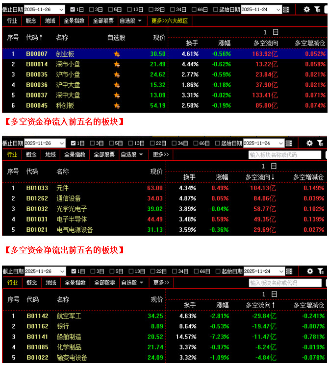 从板块资金动向数据来看,截止到今日收盘时,在资金流入榜上,元件板块以104.13亿的资金流入额位居榜首;其次是通信设备板块,资金流入84.06亿;此外,光学光电子板块、电子半导体板块、电气电源设备板块也都相继上榜,三个板块的资金流入额分别为58.77亿、49.35亿、29.69亿;再看资金流出榜,航空军工板块引领做空,资金流出29.84亿;其次是银行板块,资金流出19.47亿;此外,船舶制造板块、化学制品板块、输变电设备板块的资金流出额也都相对较多,分列资金流出榜第三到第五名位置。综合比较后可知,今日不仅元件板块资金流入高达104亿,通信设备、光学光电子、电子半导体等板块的资金流入额也都在49亿之上,科技类板块仍在持续做多,有效的维持住了场内的多方人气;反观空方阵营,虽然航空军工板块、银行板块、以及船舶制造板块的资金流出额也都在10亿之上,但其余板块资金流出均不足7亿,与多方力量相比,整体抛压仍相对较小。从六大战区的情况分别来看,截止到今日收盘时,六个战区均为资金流入状态,且创业板战区与深中大盘战区资金流入双双超过130亿。可见今日多方仍在全面发力,各战区均有资金连续回流,说明虽大盘没有上涨,但投资者进场做多的热情并没有明显减弱。在这种情况下,行情向下的空间就会被多方逐渐封杀,后市则有望在资金的推动下再次向3900点整数关口发起冲击,一旦形成有效突破,市场短期反弹就将有望得到延续。建议大家在控制好仓位的同时,可关注近期有资金连续加仓且股价短期走势重新转强的优质个股,逢低吸纳。
