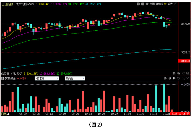 再看图2,今日大盘窄幅震荡整理,最终收出一颗阴十字星。目前指数仍完全运行在34日成本均线下方,市场短期走势依然偏弱势。从下方的多空资金来看,今日多空资金为流入状态,但资金流入量较昨日明显减少,说明经过前两天的连续反弹后,多方后续力量开始出现衰减。同时我们还注意到,上方的5日成本均线已下移至3907点,这就意味着,若是市场继续向上反弹,在3890点至3910点这20个点的区间内,将要连续面对34日成本均线、3900点整数关口、以及5日成本均线三道重要阻力。如果多方徘徊犹豫,迟迟无法快速向上形成突破,一旦做多人气出现涣散,后市行情很可能会有再度下探的动作。建议大家控制好仓位,同时密切关注场内多空资金的进出情况,若多方后续力量进一步减弱,操作上仍需保持谨慎态度。
