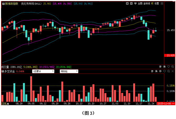 今日两市上涨个股共1692只,其中涨幅超过3%的个股338只,涨幅在9.9%以上的个股83只;下跌个股共3593只,其中跌幅超过3%的个股337只,跌幅在9.9%以上的个股12只。图3所示为指南针特有的0Z指数K线图,从图中可以看到,今日0Z指数冲高回落,小幅收阴,收盘位置依然处于优化布林下紫线附近。可见场内多数个股在经过前两日的连续回升后,今日都有所休整,0Z指数尚未回到优化布林中轨上方,市场整体走势依然偏弱。从下方的多空资金来看,今日多空资金为流入状态,但资金流入量较昨日明显减少,说明多方后续力量有衰减迹象。在这种情况下,如果空方趁机连续施压,刚刚回升起来的多方人气就会快速下降,从而导致行情出现再次回落。建议大家控制好仓位,保持谨慎
