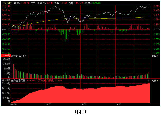 如图1所示,今日早间大盘小幅高开,指数略作回探后,很快向4100点上方发起猛攻,盘中一度摸至4121点,可惜未能直接站稳,市场遇阻回落,但在4090点上方大盘就获得支撑,午后指数再次回到4100点上方,并逐步上行,最终以4120点收盘。从下方的多空资金来看,早间开盘后,多方就占据优势,随后资金持续流入,而在市场回落过程中,场内抛压并未大幅增强,所以午后多方再次上攻时,依然较为顺畅。可见今日资金继续以流入为主,多方力量明显强于空方,且场内投资者的持股信心普遍较为坚定。在这种情况下,行情快速见顶的可能性很小,后市有望在资金的推动下继续向上攀升。建议大家可关注前期调整较为充分且近期有资金持续加的优质个股,逢低吸纳。