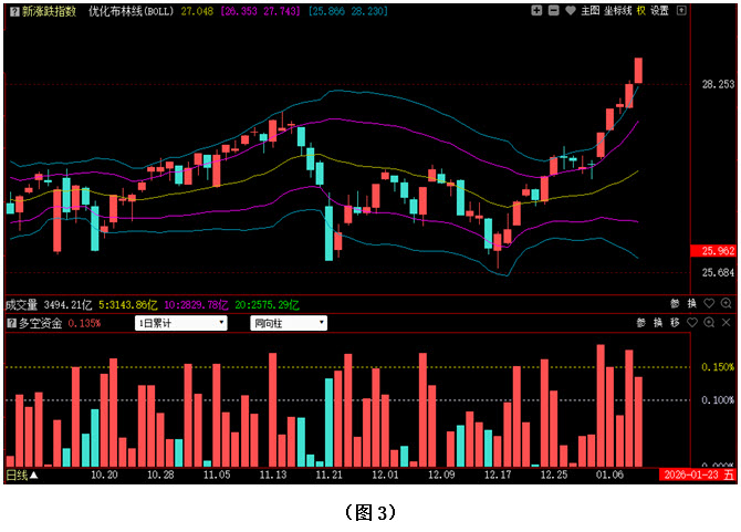 今日两市上涨个股共3920只,其中涨幅超过3%的个股893只,涨幅在9.9%以上的个股155只;下跌个股共1349只,其中跌幅超过3%的个股110只,跌幅在9.9%以上的个股3只。图3所示为指南针特有的0Z指数K线图,从图中可以看到,今日0Z指数依然运行在优化布林上轨上方,并继续向上快速拉升,再次收出一根涨幅超过1%的阳线。可见今日场内多数个股都出现了连续快速上涨,市场整体走势十分强劲。从下方的多空资金来看,今日多空资金为流入状态,尽管资金流入量较昨日有所减少,但依然处于较高水平,说明多数投资者对后市仍持乐观态度,多方后续力量十分充足。在这种情况下,多方的势头就很难被快速压制,接下来行情或仍有继续上扬可能。