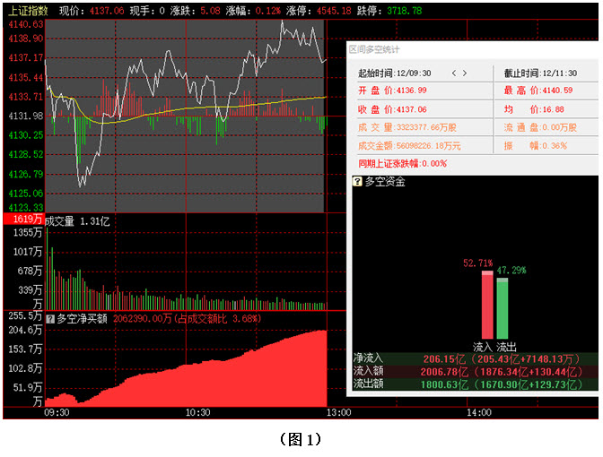 今日早间大盘小幅高开,市场略作回探后,开始逐步向上攀升,至中午收盘时,指数位于4137点。从日K线图上看,与前两日相同,今天上午大盘依然完全运行在5日成本均线上方,指数虽有上扬,但幅度很小,可见市场短期走势仍处于强势格局当中,不过由于春节长假临近,行情出现大幅拉升的可能性并不是很大。从下方的多空资金来看,早间开盘后,多方就占据优势,随后资金持续流入。截止到中午收盘时,沪市当中多方力量高于空方超过5个百分点,资金流入200多亿。从六大战区的情况分别来看,截止到今日中午收盘时,六个战区均为资金流入状态,其中不仅沪中大盘战区与深中大盘战区资金流入双双超过百亿,创业板战区的资金流入额更是高达172亿。可见今日上午虽然大盘看似徘徊不前,但各战区均有资金积极进场加仓,说明目前多数投资者对后市依然十分看好。在这种情况下,行情在节前很难出现连续大幅回落,而随着多方力量的不断积累,只要春节长假期间没有重大利空因素影响,节后大盘很可能会向4200点整数关口发起挑战。建议大家紧跟资金步伐,积极优选个股,择机介入。