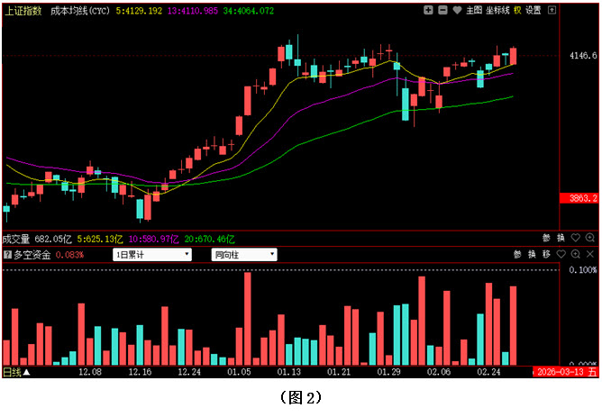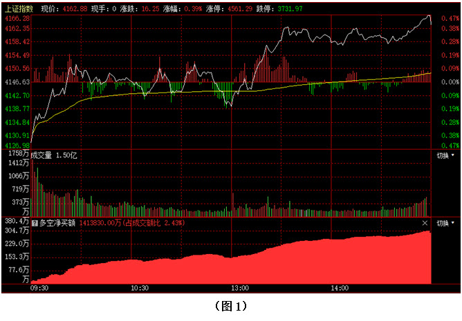 如图1所示,今日早间大盘低开,但指数并未趁势下探,而是很快向上发起反击,不过4150点上方的压力依然较强,市场无法持续上攻,只得先围绕着昨日收盘点位做窄幅震荡整理,午后大盘快速突破4150点一带的阻力,并出现进一步上扬,指数最终以4162点收盘。从下方的多空资金来看,早间开盘后,多方就占据优势,随后资金持续流入,即便盘中指数多次在4150点上方遇阻,场内也没有出现大量恐慌性抛盘。可见今日资金仍在积极进场加仓,所以盘中出现的抛压就会被多方快速化解。在这种情况下,后市将有望在资金的推动下继续向上攀升。建议大家关注近期有资金连续大幅加仓的板块,并在其中优选个股,逢低逐步吸纳。