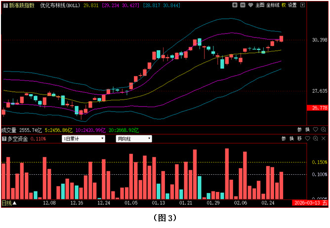 今日两市上涨个股共3164只,其中涨幅超过3%的个股603只,涨幅在9.9%以上的个股94只;下跌个股共1884只,其中跌幅超过3%的个股163只,没有跌幅在9.9%以上的个股。图3所示为指南针特有的0Z指数K线图,从图中可以看到,今日0Z指数突破了优化布林上紫线,并继续向上拉升,最终收出一根光头阳线,再次创出年内新高。可见今日场内多数个股都在持续上涨,市场整体走势依然较强。从下方的多空资金来看,今日多空资金为流入状态,且资金流入量较昨日有所增大,说明投资者进场参与做多的意愿依然普遍较强。在这种情况下,即便行情有所反复,市场回探的空间也将十分有限,后市有望在资金的推动下继续向上拓展。