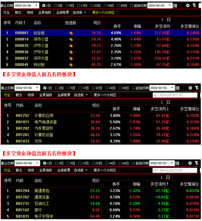 从板块资金动向数据来看,截止到今日收盘时,在资金流入榜上,计算机应用板块以83.47亿的资金流入额位居榜首;其次是电气电源设备板块,资金流入61.25亿;此外,汽车零部件板块、计算机设备板块、元件板块也都相继上榜,三个板块的资金流入额分别为45.49亿、39.12亿、37.90亿;再看资金流出榜,普通有色板块引领做空,资金流出22.18亿;其次是通信设备板块,资金流出18.02亿;此外,石油化工板块、银行板块、电子半导体板块的资金流出额也都相对较多,分列资金流出榜第三到第五名位置。综合比较后可知,今日不仅计算机应用板块资金流入超过80亿,电气电源设备、汽车零部件、计算机应设备、元件等板块的资金流入额也都在35亿之上,场内多方人气进一步回升,全天资金流入超过10亿的板块多达24个;反观空方阵营,虽然普通有色板块资金流出超过20亿,同时通信设备板块的资金流出额也在15亿之上,但其余板块中的抛压普遍较小,与昨日相比,空方力量进一步减弱。从六大战区的情况分别来看,截止到今日收盘时,六个战区均为资金流入状态,其中不仅沪中大盘战区资金流入高达145亿,创业板战区与深中大盘战区的资金流入额更是双双超过210亿。可见今日多方仍在全面发力,各战区均有资金持续大幅回流,说明随着大盘向上反弹,投资者的做多热情正在快速回升。在这种情况下,行情下跌的势头就暂时得了遏制,只要接下来空方无法再次连续施压,市场就会有再次向上攀升的可能。建议大家在控制好仓位的同时,关注近期有资金积极回流加仓的板块,并在其中优选个股,择机吸纳。