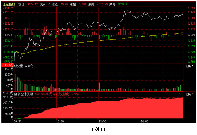 如图1所示,今日早间大盘再次低开,但指数并未趁势下探,而是很快出现反弹,不仅顺利回升至4100点整数关口上方,而且还继续向上攀升,盘中一度摸至4129点,随后市场在4120点上方窄幅震荡整理,并最终以4124点收盘。从下方的多空资金来看,早间开盘后不久,空方曾试图施压,导致资金一度小幅翻绿,但随着大盘向上连续反弹,多方很快重新占据优势,之后资金更是持续流入。可见今日资金回流依然十分积极,多方力量明显强于空方。在这种情况下,行情短期或有继续向上回升的可能。但同样是反弹,有些个股已经将前几日的失地完全收复,而有些个股则依然受到均线压制,强弱区别十分明显。故此建议大家在关注大盘走势的同时,更要认真甄别手中个股,对于反弹力度较弱且资金回流不足的个股,可逢高逐步减仓;而对于反弹力度较强且资金大幅流入的个股,则可继续以持股为主。