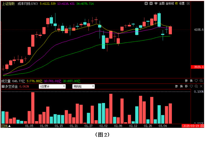 再看图2,今日大盘低开后再次向上反弹,最终以阳线报收,且收盘位置已回到5日成本均线上方,说明市场短期走势有转强迹象。从下方的多空资金来看,今日多空资金为流入状态,且资金流入量较昨日有所放大,说明多方不仅连续发力反击,且随着反弹的延续,更多场外观望开始加入到做多行列,有利于后市继续向上回升。但需要注意的是,今日的收盘点位只是略高于5日成本均线,还无法断定大盘是否已经对5日成本均线形成有效突破。所以若接下来多方后续力量无法及时跟上,行情很可能还会出现反复。故此建议大家在控制好仓位的同时,密切关注多空资金的进出情况以及5日成本均线对大盘的支撑情况,若多方后续无力,5日成本均线再度失守,操作上则仍需谨慎。