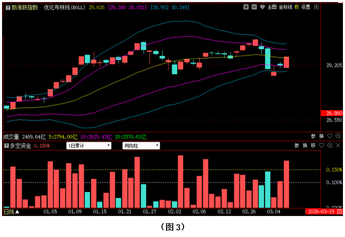 今日两市上涨个股共4069只,其中涨幅超过3%的个股1124只,涨幅在9.9%以上的个股105只;下跌个股共1051只,其中跌幅超过3%的个股164只,跌幅在9.9%以上的个股2只。图3所示为指南针特有的0Z指数K线图,从图中可以看到,今日0Z指数同样低开高走,收出阳线,且收盘位置重新站到优化布林中轨上方。可见今日场内多数个股都延续了昨日的反弹,继续向上回升,0Z指数逐步深入到周二阴线实体内部,市场整体走势出现转强迹象。从下方的多空资金来看,今日多空资金为流入状态,且资金流入量进一步放大,说明随着反弹幅度的加大,越来越多的场外资金开始进场抄底。但周二的阴线实体尚未被完全吞没,故此多方后续力量还需及时跟上,否则一旦空方再次施压,行情很可能会出现反复。建议大家控制好仓位,不要盲目重仓追涨,可关注近期有资金连续回流的个股,跟踪观察,逢低逐步吸纳。