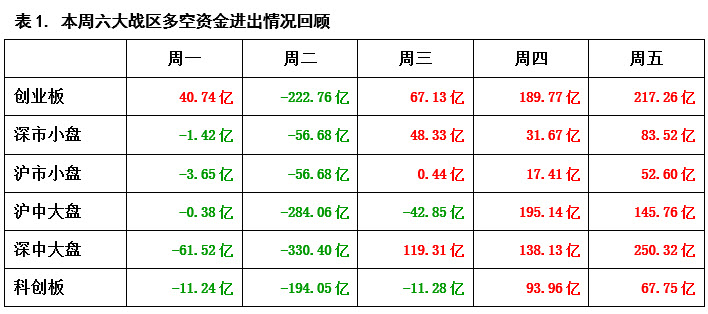 从表1的每日六大战区多空资金进出情况中可以看到,本周一只有创业板战区为资金流入状态,其余五个战区则均为资金流出,所以虽然周一大盘出现小幅上涨,但实际上市场内部已经没有了继续上攻的动能,从而导致周二面对近在咫尺的4200点整数关口,大盘却难以逾越,而当指数回探时,资金则大幅出逃;好在周三抛压就有所减弱,且多数战区已经迎来资金回流。周四与周五,多方更是连续发力,资金积极进场。在这种情况下,行情就很难出现连续大幅杀跌,下周大盘或有进一步向上反弹的可能。