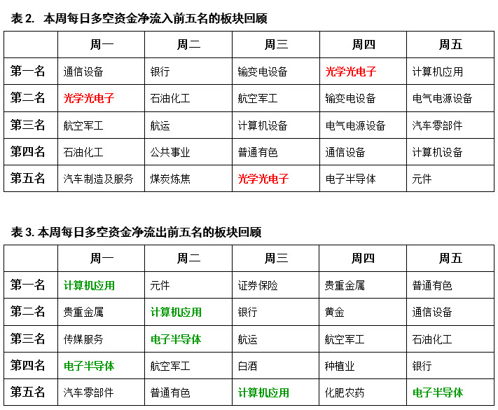 从表2的每日资金流入排行榜前五名来看,本周做多较为积极的是光学光电子板块,该板块在本周五个交易日内三度出现在资金流入榜前五名之内。同时在周三至周五市场逐步反弹过程中,输变电设备板块、电气电源设备板块也连续发力做多,这就说明在中东局势紧张、国际油价上涨的背景下,市场对电力能源的需求很有可能会出现显著增加,所以电力相关板块与个股获得了更高的未来预期,受到资金持续青睐。
