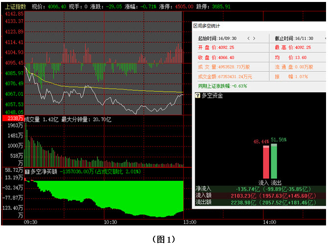 今日早间大盘继续向下回探,盘中一度跌破4050点,随后市场虽有反弹,但力度较弱,至中午收盘时,指数位于4066点。从日K线图上看,今天上午大盘延续了上周四与上周五的下跌走势,指数跌破34日成本均线支撑,并继续向下回落,市场短期走势依然偏弱,若多方无法快速夺回34日成本均线,不排除后市有重新考验4000点整数关口的可能。从下方的多空资金来看,早间开盘后不久,空方就占据优势,随后资金持续流出。截止到中午收盘时,沪市当中多方力量低于空方超过3个百分点,资金流出130多亿。从六大战区的情况分别来看,截止到今日中午收盘时,创业板战区、深市小盘战区、以及沪市小盘战区均为资金流入状态,但三个战区的资金流入总额还不足55亿;其余三个战区则均为资金流出,且沪中大盘战区的资金流出额就高达125亿。可见今日上午虽然资金流入的战区数量与资金流出的战区数量相等,但整体上资金明显以流出为主,空方力量强过多方。在这种情况下,行情就难以快速形成有力反弹,后市若空方继续施压,大盘仍有震荡下探的可能。建议大家控制好仓位,谨慎操作。
