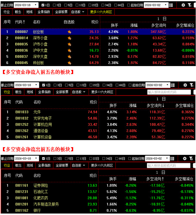从板块资金动向数据来看,截止到今日收盘时,在资金流入榜上,元件板块以118.31亿的资金流入额位居榜首;其次是光学光电子板块,资金流入112.39亿;此外,计算机应用板块、通信设备板块、计算机设备板块也都相继上榜,三个板块的资金流入额分别为100.47亿、79.48亿、51.36亿;再看资金流出榜,证券保险板块引领做空,资金流出17.56亿;其次是石油化工板块,资金流出15.25亿;此外,化肥农药板块、汽车制造及服务板块、银行板块的资金流出额也都相对较多,分列资金流出榜第三到第五名位置。综合比较后可知,今日不仅元件板块、光学光电子板块、以及计算机应用板块资金流入均超过了百亿,通信设备、计算机设备等板块的资金流入额也都在50亿之上,场内多方人气有所回升;反观空方阵营,虽然证券保险、石油化工、银行等权重板块纷纷出现在资金流出榜前列,但各板块的资金流出额均不足18亿,整体抛压较昨日明显减弱。从六大战区的情况分别来看,截止到今日收盘时,六个战区均为资金流入状态,其中不仅深中大盘战区与科创板战区资金流入双双超过80亿,创业板战区的资金流入额更是高达347亿。可见今日虽然大盘只是大幅回升,但各战区却迎来资金大幅回流,说明当行情出现企稳迹象后,场外资金进场抄底的意愿十分强烈。在这种情况下,市场向下的空间就会被多方快速封杀,接下来只要多方后续力量不断跟上,大盘就有望进一步向上反弹。建议大家可在控制好仓位的同时,关注先于大盘企稳回升的板块,并在其中优选个股,逢低介入。