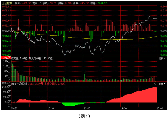 如图1所示,今日早间开盘后,大盘继续下探,盘中一度跌至4023点,好在4000点整数关口附近的支撑依然有效,指数没有进一步杀跌,午后市场开始逐步向上回升,大盘不仅将上午的失地完全收复,且在尾盘有继续上攻动作,指数最终以4062点收盘。从下方的多空资金来看,早间开盘后,多方率先占据优势,但资金进场并不积极,且随着大盘逐步下行,场内抛压再次增大,导致资金由红翻绿,好在午后市场开始连续回升,资金也随之出现快速回流。可见今日早间资金就有抄底迹象,午后随着大盘回暖,资金抄底的力度更是快速增强,说明大家对4000点一带的支撑普遍较为看好。在这种情况下,市场中的恐慌情绪就会明显下降,做多愿意开始再次提升,所以行情短期内或有进一步向上反弹的可能。建议大家在控制好仓位的同时,可关注在大盘下跌过程中资金流出较少且目前短期趋势依然保持向上的优质个股,逢低吸纳。