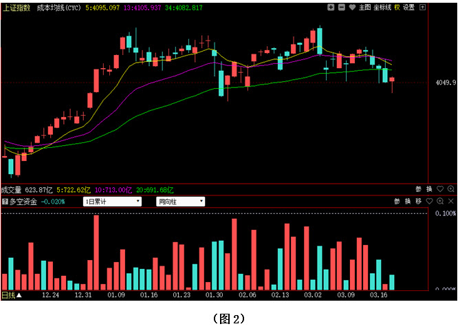 再看图2,今日大盘虽有下探动作,但在多方及时反击下,指数并未继续下行,反而最终略有上涨,以小阳线报收。不过由于上涨幅度较小,指数未能深入到昨日阴线实体内部,收盘位置依然处于34日成本均线下方,可见目前市场短期走势依然偏弱。从下方的多空资金来看,今日多空资金为流出状态,且资金流出量大于昨日的资金流入量,说明虽然大盘出现了反弹,但资金并未同步进场。而随着大盘5日成本均线与34日成本均线的逐渐靠拢,4080点上方的压力正在进一步增大。在这种情况下,建议大家在控制好仓位的同时,密切关注多空资金的进出变化以及34日成本均线对大盘的压制情况,如果多方的后续力量无法及时跟上,导致大盘反弹到34日成本均线附近再度遇阻,无法向上形成突破,那么短暂反弹后行情很可能会有再次下探的动作,操作上还需谨慎。