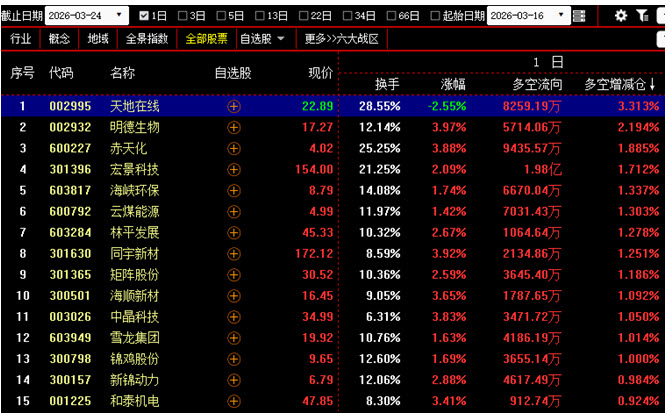 【今日多空资金增仓前200名中涨幅最小的15只个股】