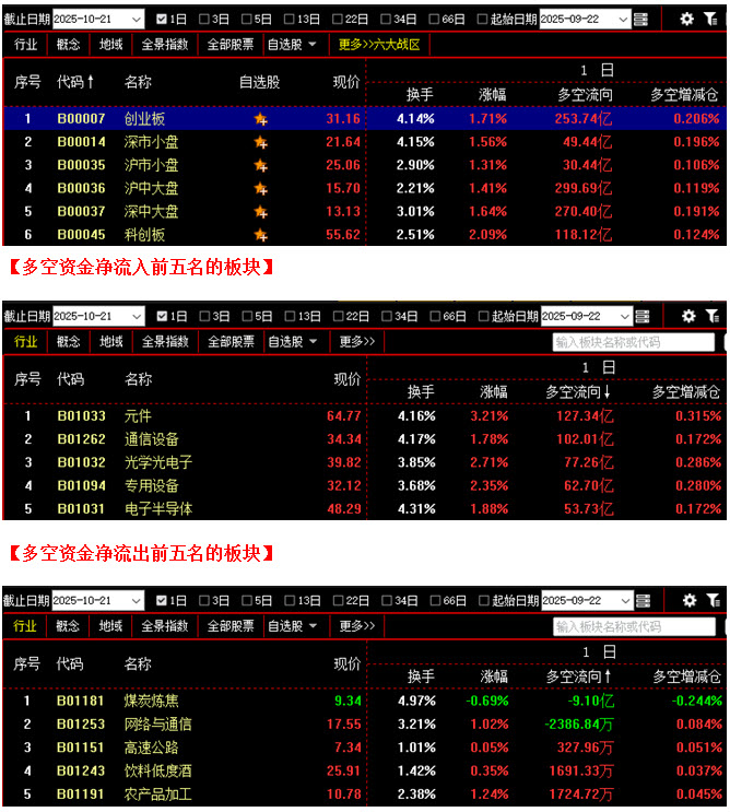 从板块资金动向数据来看,截止到今日收盘时,在资金流入榜上,元件板块以127.34亿的资金流入额位居榜首;其次是通信设备板块,资金流入102.01亿;此外,光学光电子板块、专用设备板块、电子半导体板块也都相继上榜,三个板块的资金流入额分别为77.26亿、62.70亿、53.73亿;再看资金流出榜,除煤炭炼焦板块资金流出9.10亿之外,只有网络与通信板块略有资金流出。综合比较后可知,今日不仅元件板块与通信设备板块资金流入双双超过百亿,光学光电子、专用设备、电子半导体等板块的资金流入额也都在50亿之上,这其中不少板块在昨日就已大幅做多,今日的持续走强更是令场内多方人气进一步提升,以至全天资金流入超过10亿的板块多达27个;而空方阵营中只有两个板块为资金流出状态,整体抛压很小。从六大战区的情况分别来看,截止到今日收盘时,六个战区均为资金流入状态,其中不仅科创板战区资金流入高达118亿,创业板战区、沪中大盘战区、以及深中大盘战区的资金流入额更是都在250亿之上。可见今日各战区均有资金大幅进场加仓,抢筹迹象十分明显,所以多方力量远远强于空方,具备压倒性优势。在这种情况下,不仅大盘已将上周五失地完全收回,行情短期走势再度转强,而且接下来指数很可能会突破前期的3936高点,为后市打开进一步上涨的空间。建议大家关注近两日有资金大幅回流的板块,并在其中选择短期趋势保持向上的优质个股,逢低择机介入。