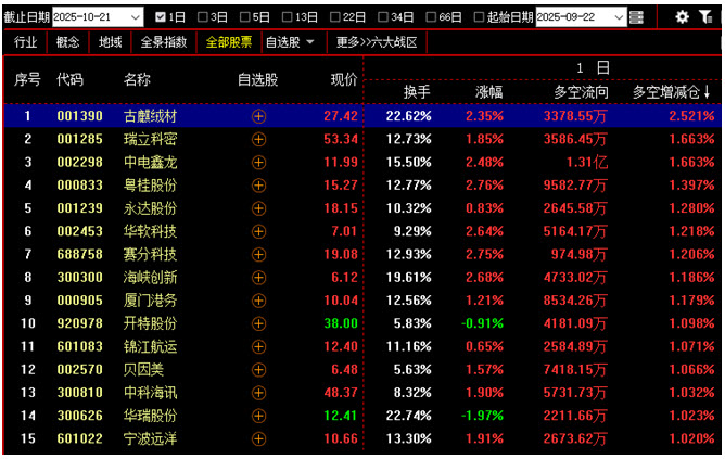 【今日多空资金增仓前200名中涨幅最小的15只个股】