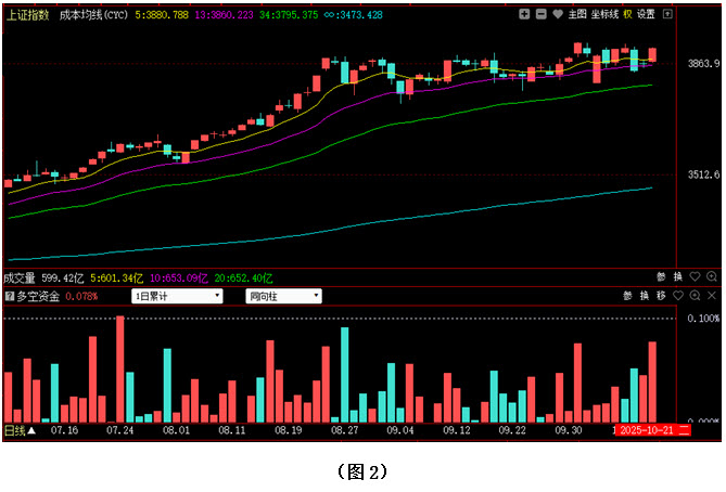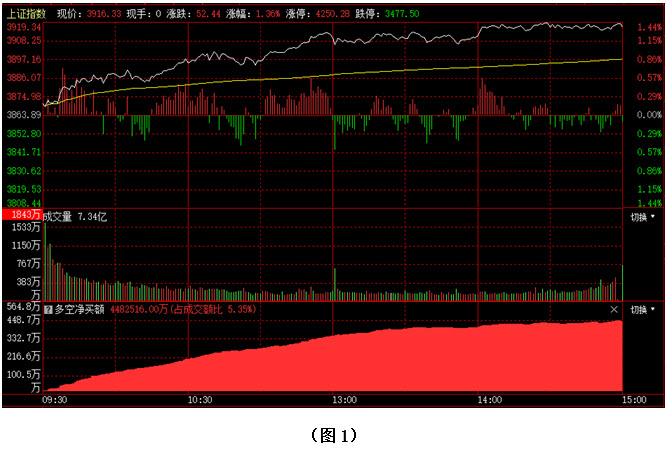 如图1所示,今日早间大盘小幅高开,并很快跃上3880点,在3880点上方指数略作震荡整理,随后多方继续上攻,市场重新夺回3900点整数关口,午后尽管大盘上行速度明显减缓,但指数一直稳步运行在3900点上方,最终以3916点收盘。从下方的多空资金来看,早间开盘后,多方就占据优势,随后资金持续流入,而空方则毫无反击之力。可见今日资金进场态度十分坚决,多方力量远远强于空方。在这种情况下,行情再次冲上3900点,站稳的底气显然就会更足一些。建议大家在控制好仓位的同时,密切关注场内多空资金的进出情况以及3900点整数关口附近的支撑力度,若多方连续发力,且大盘在本周接下来的几个交易日内,都能站稳在3900点上方,则可认为市场对3900点形成了有效突破,后市将有望创出新高并向4000点大关发起冲击;反之,如果多方后续力量不足,3900点整数关口又一次得而复失,那么在屡屡上冲失败的背景下,投资者的做多信心就会快速下降,从而导致后市出现更深幅度的调整。