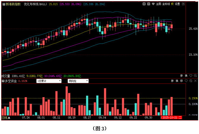 今日两市上涨个股共4628只,其中涨幅超过3%的个股965只,涨幅在9.9%以上的个股94只;下跌个股共729只,其中跌幅超过3%的个股66只,跌幅在9.9%以上的个股3只。图3所示为指南针特有的0Z指数K线图,从图中可以看到,今日0Z指数同样高开高走,收出阳线,虽然未能将上周四与上周五的两根阴线实体完全吞没,但收盘位置已再次回升至优化布林中轨上方。可见今日场内多数中小盘个股都出现了连续回升,市场整体走势出现重新转强的迹象。从下方的多空资金来看,今日0Z指数的多空资金为流入状态,且资金流入量较昨日进一步放大,说明不仅有资金在连续进场加仓,而且加仓的力度也在增强。不过需要注意的是,目前0Z指数依然运行在8月26日以来震荡区间内部,尽管暂时离开了震荡区间的下沿位置,市场向下破位的风险大幅减弱,但0Z指数也还没有向上形成突破,所以接下来行情仍有震荡反复的可能。建议大家控制好仓位,不要盲目重仓追涨,可关注近期出现过快速回调的热门个股,若在黄金坑超跌信号出现后,有资金连续回流,则可逢低吸纳。